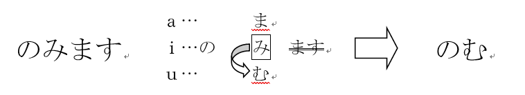 Ⅰ i→u、ます→× 飲(の)みます → 飲(の)みます → のむ 遊びます → あそびます → あそぶ
