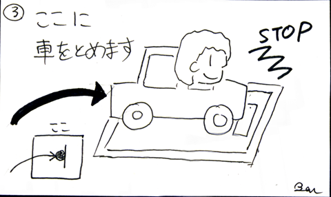 ―――すみません。自転車は駐輪場( に・で )停めてください。